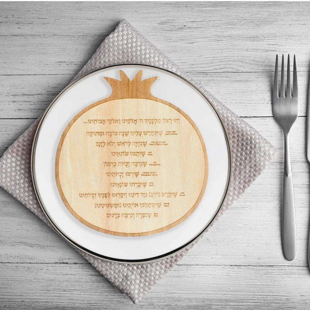 Pomegranate shaped wood Rosh Hashanah Simanim card is the perfect way to enhance your holiday table making it simple for each member of your family to follow along clearly and easily. The perfect way to follow Prayers for customary foods eaten during the Rosh Hashanah festival.
