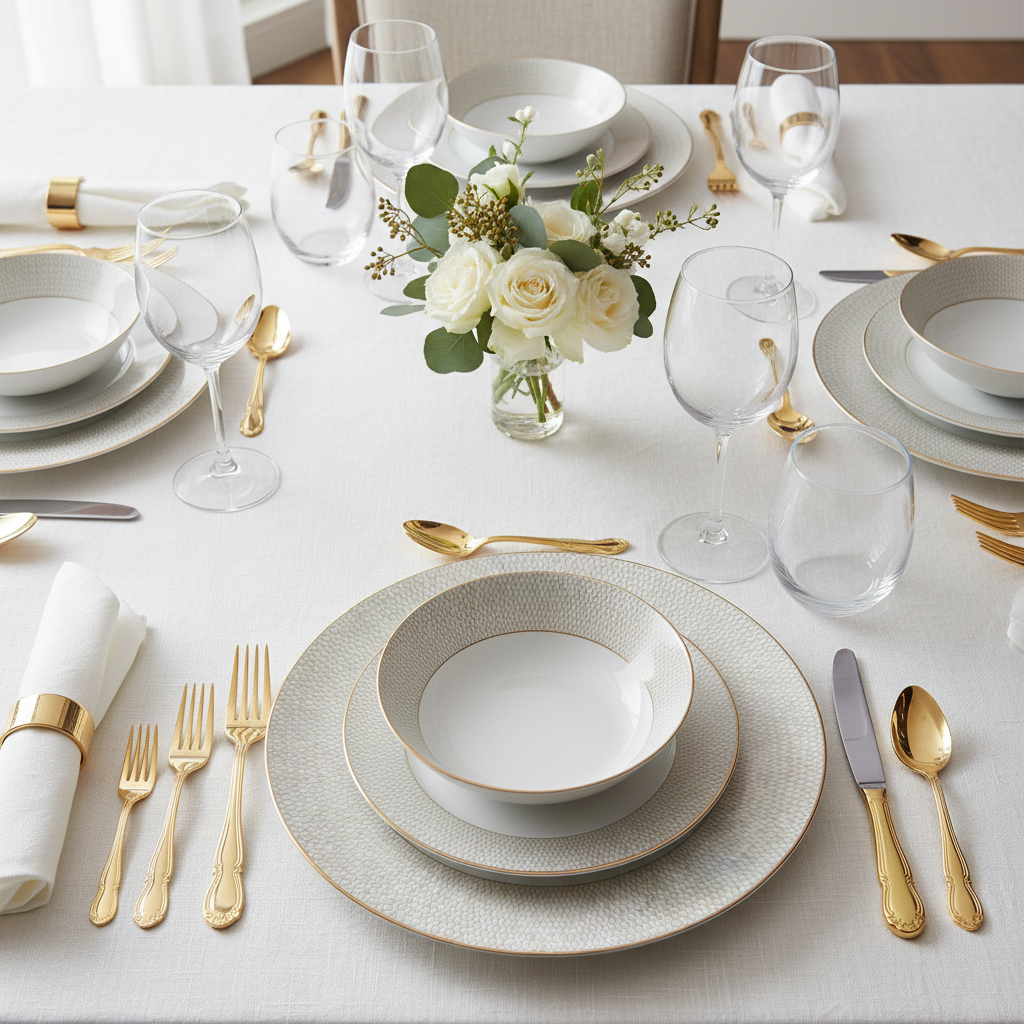 Prestigious Wedgwood Gio Gold dinner service for four featuring twelve pieces with timeless design and luxurious gold accenting.