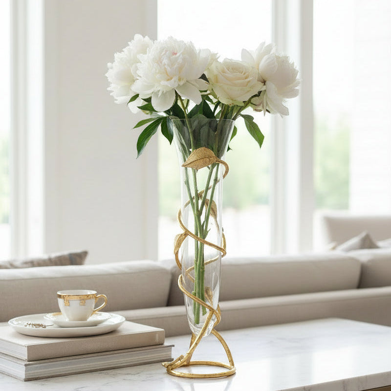 Infuse your home with earthiness and elegance with this leaf-designed vase. The gold base seems to be embracing the glass in a tangle of branches and leaves. Once the flowers inside the vase dry up, easily discard them by removing the glass from the base.