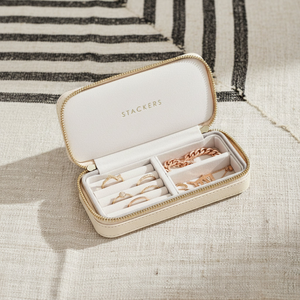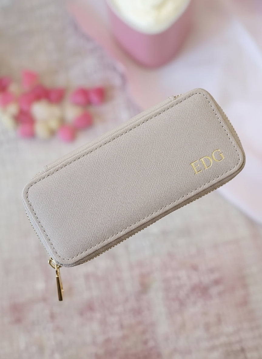 Taupe travel jewellery box with soft velvet lining and removable divider, your perfect companion for keeping treasured pieces safe and organised wherever your adventures take you.