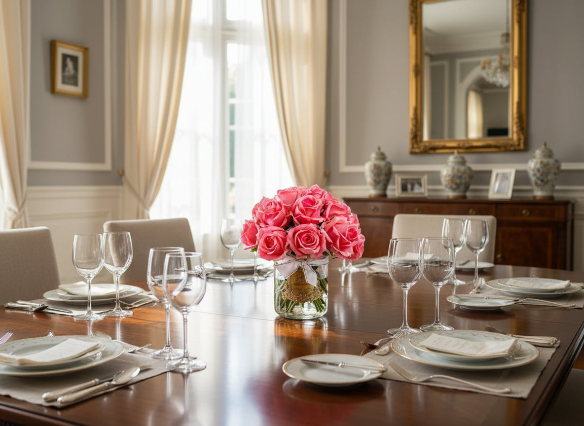 Elevate your space with this stunning Cote Noire Grand Bouquet featuring lifelike mixed pink rosebuds in luxurious clear glass, a timeless centrepiece that brings enduring elegance to any room.