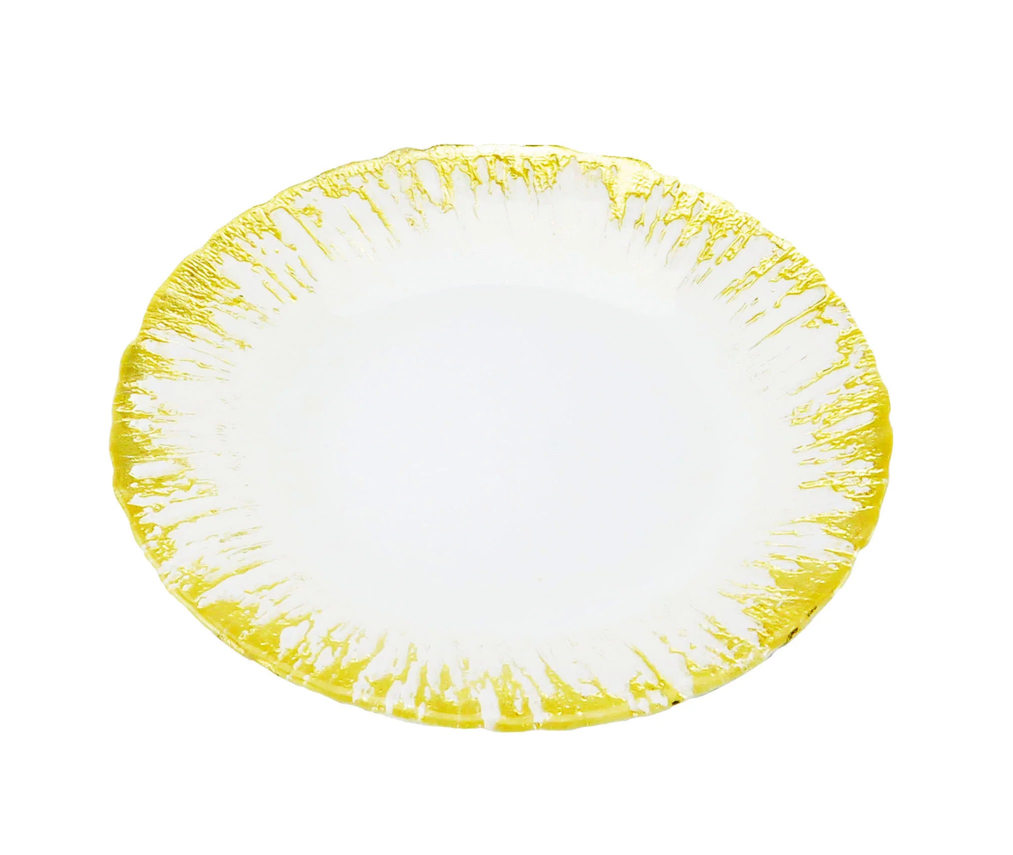 Frothy white milk and dripping gold combined in a dish, isn't that beautiful?! This opaque white plate is part of a larger set with the same design. The gold dripping seems to have a mind of its own, knowing just where to stop so this piece is elegant and not messy. Like a flash of bolting, the gold design is artfully designed on the interior, a unique differentiation from the usual outer designs. The edge of this plate is artfully jagged to incorporate modern design into this contemporary/traditional piece. Dimensions-8"D