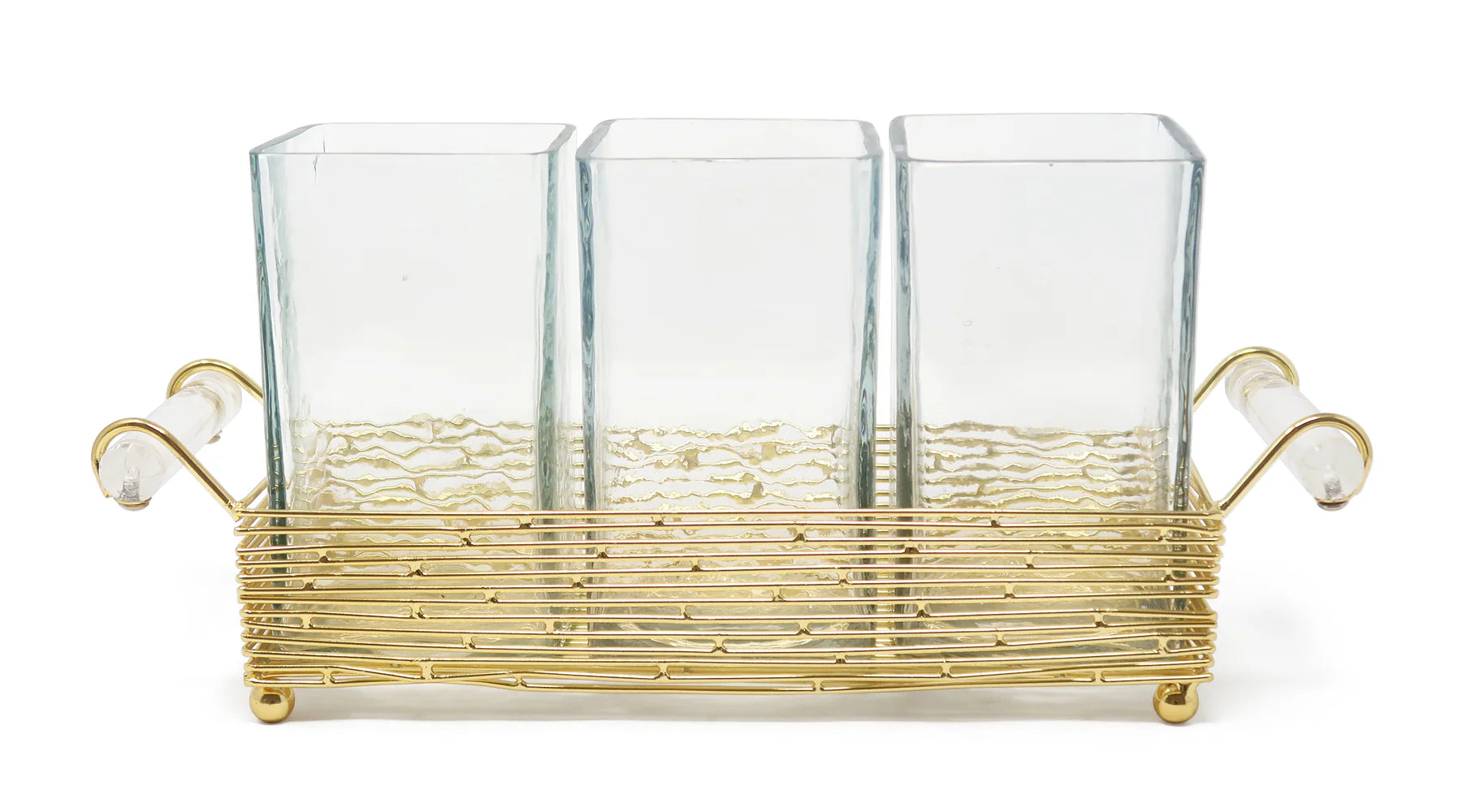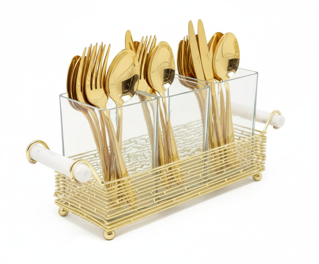 Elevate your table with this refined cutlery holder, featuring a gleaming gold stand and elegant cylinder handle to organise your silverware in style.